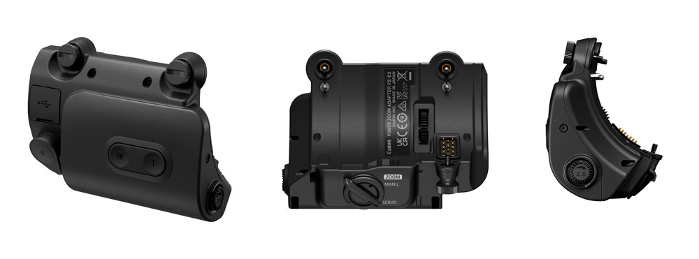Darüber hinaus ist es mit den Power-Zoom-Adaptern PZ-E2 und PZ-E2B kompatibel, die Canon ab März 2024 für für 1200 beziehungsweise 1600 Euro anbieten will. Die beiden Power-Zoom-Adapter beziehen den Strom aus dem Kameraakku, können jedoch auch mit einem externen USB-C-Netzteil versorgt werden. Das Zoomen wird über zwei Tasten gesteuert, die Zoomgeschwindigkeit lässt sich über ein Einstellrad verändern. Der Power-Zoom-Adapter PZ-E2B verfügt zusätzlich über einen 20-poligen Anschluss für eine Zoom-/Fokus-Fernbedienung, an den kompatible Zoom-/Fokusantriebe in Studio- oder Großproduktionsumgebungen angeschlossen werden können. Er ist auch mit der Canon Zoomwippe ZSG-C10 kompatibel.
