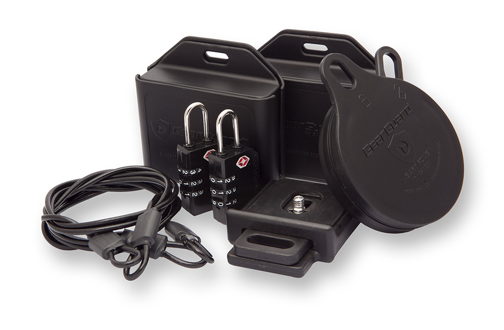 Zur Sicherung von Objektiven auf Reisen gibt es als Bestandteil der Pro Kits den „GearGuard Lens Lock“. Dieser wird am Objektiv befestigt und dann mittels eines GearGuard-Sicherheitskabels in der Fototasche verankert.