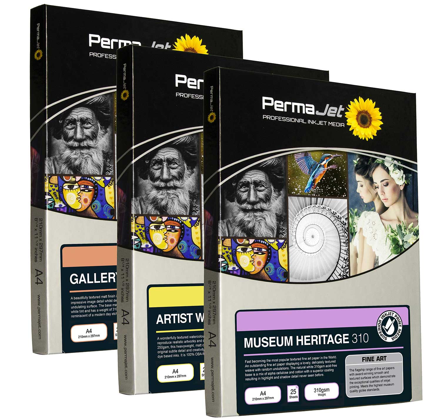 Mit den drei neuen, säurefreien und strukturierten Fine Art-Inkjet-Druckpapieren setzt PermaJet wieder einmal hohe Standards. Fotografen und Künstler werden die extrem lebendige Farbwiedergabe, die exakte Grauwertumsetzung sowie die unvergleichbare Schatten- und Lichterzeichnung schätzen. Museum Heritage 310, Gallery Etching 310 und Artist Watercolour 250 berauschen die Sinne durch ihre individuelle Haptik und Ausstrahlung.