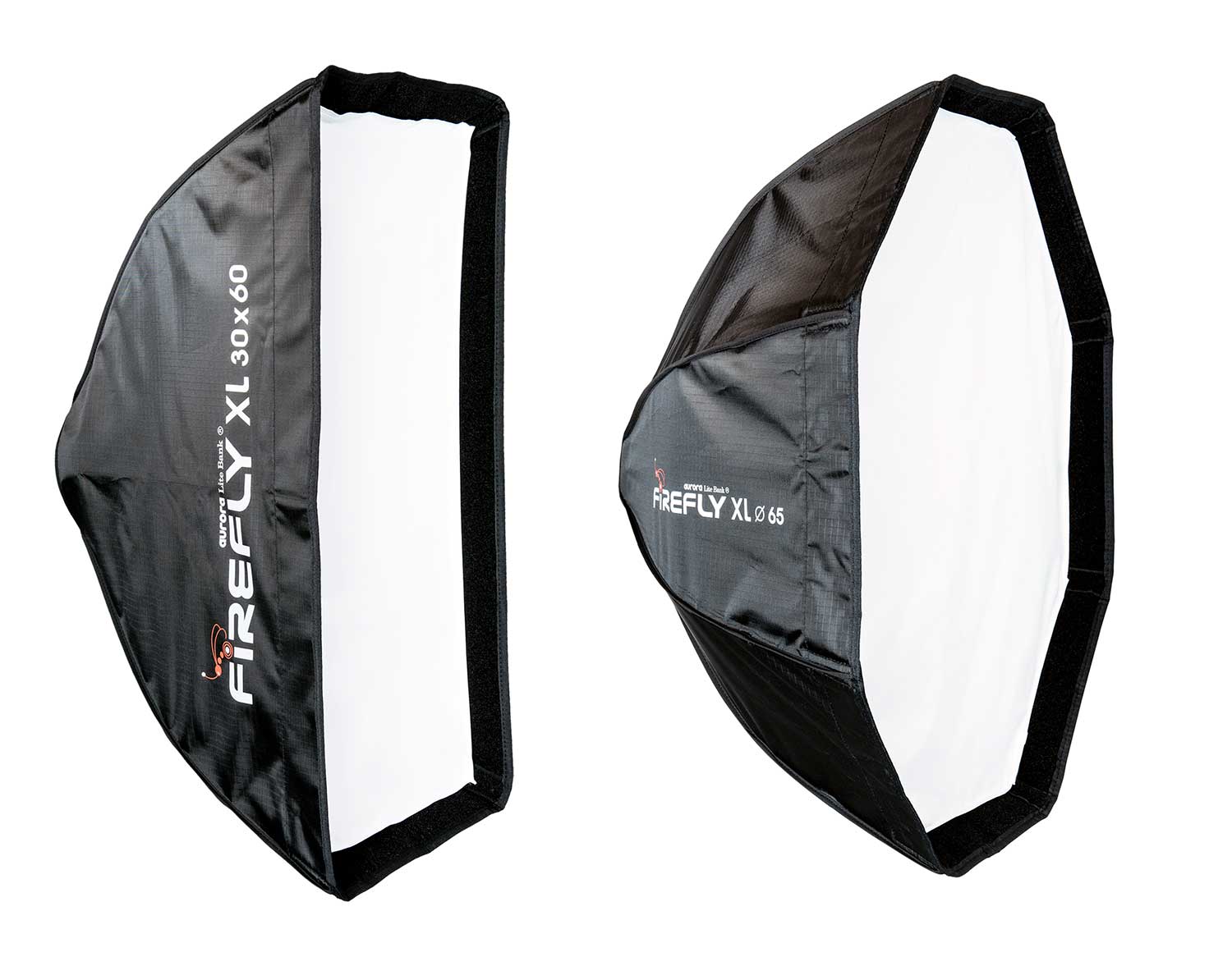 Bisher waren die Firefly XL-Softboxen als „Octaboxen“ in den Durchmessern 90 cm und 120 cm sowie als rechteckige Boxen mit 60 × 60 cm und 60 × 80 cm lieferbar. Ab sofort ist die Octabox auch mit 65 cm Durchmesser und die rechteckige Version im Format 30 × 60 cm erhältlich. Sie sind im Vergleich zu den größeren Modellen noch platzsparender bei gleichzeitig hoher Lichtausbeute. Um die Lichtcharakteristik flexibel der jeweiligen Aufnahmesituation anpassen zu können, kann wahlweise mit oder ohne Front- beziehungsweise Innendiffusor gearbeitet werden.