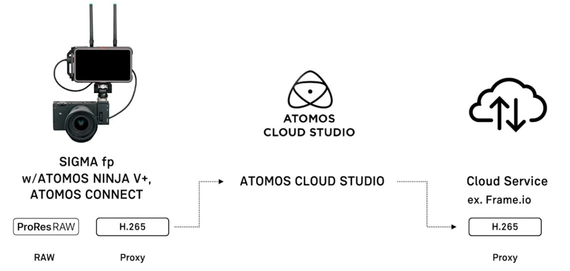 Für die Cloud Connection selbst wird ATOMOS Cloud Studio benötigt, das Atomos bereitstellt, sowie Cloud Service Tools wie ex. Frame.io. Die Nutzung der von ATOMOS bereitgestellten Cloud-Lösung setzt ein Firmware-Update der ATOMOS-Geräte voraus (noch nicht erschienen).