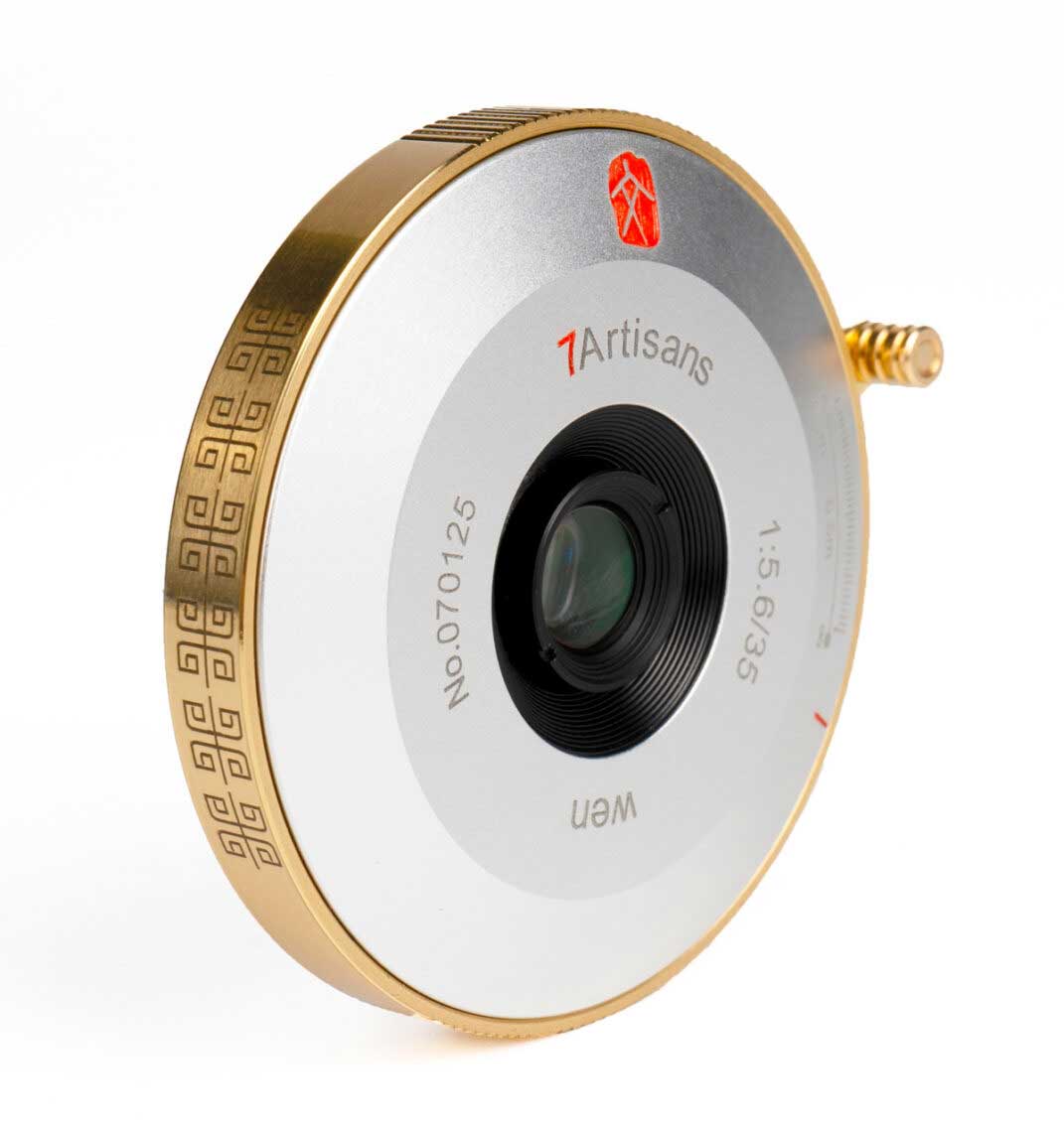 Der chinesische Objektivhersteller 7Artisans präsentiert mit dem 35mm f/5,6 WEN Pancake ein Fliegengewicht für Leica M-Kameras. Das 35-Millimeter-Vollformatobjektiv ist 5,6 Zentimeter flach und wiegt nur 128 Gramm. Das optische System des Objektivs besteht aus 5 Elementen, die in vier Gruppen angeordnet sind. Die Blendenöffnung von f/5,6 ist nicht verstellbar und die Fokussierung erfolgt ausschließlich manuell bis zu einem Mindestabstand von 30 Zentimetern. Auffallend ist der geriffelte Fokussierhebel und die Kombination aus silber- und goldfarbenem Metall.