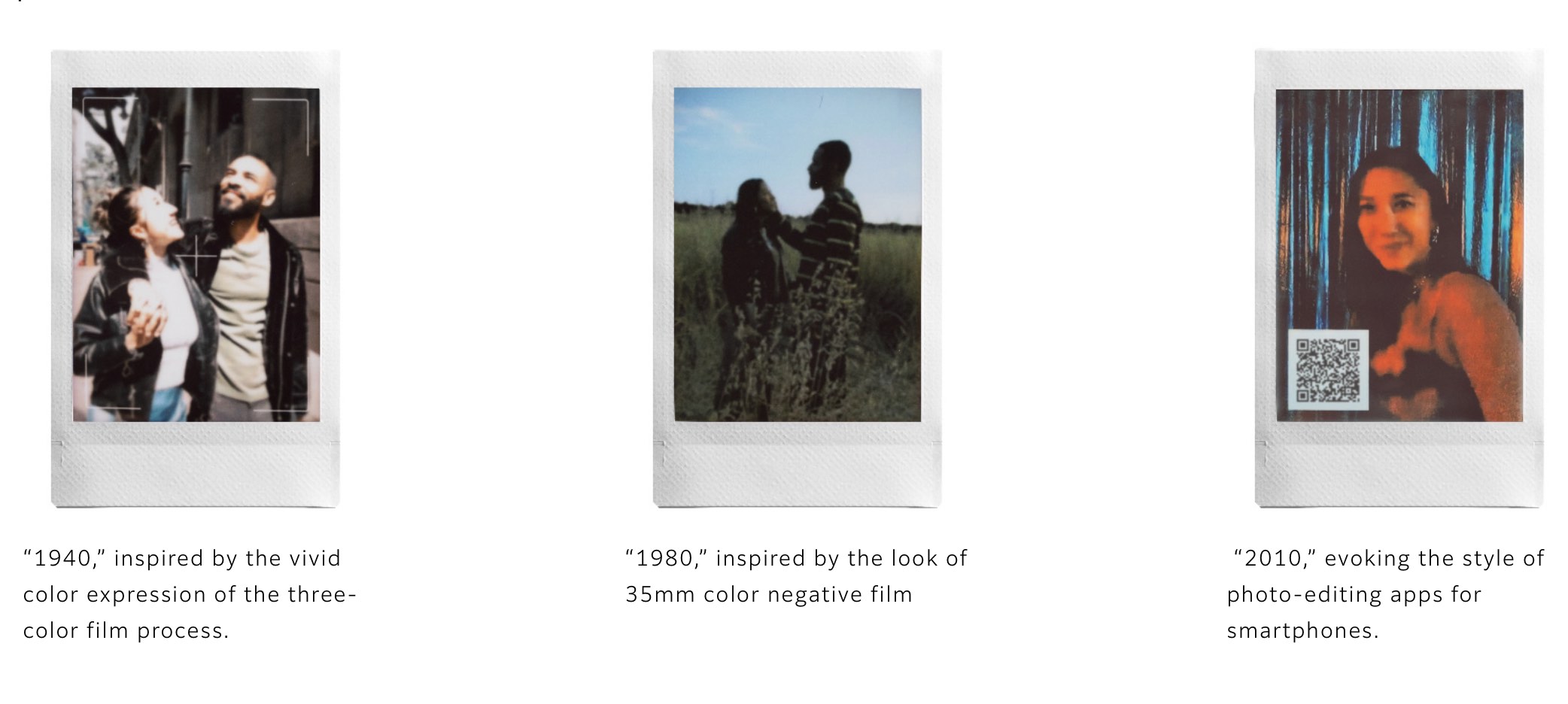 Der Clou dabei: Auf dem Ausdruck wird ein QR-Code mitgedruckt. Scannt man diesen mit einem Smartphone, wird man zu einer Webseite weitergeleitet, auf der der zugehörige Videoclip abgespielt werden kann. Fujifilm sichert ein Hosting dieser Clips für einen Zeitraum von bis zu zwei Jahren nach dem Hochladen zu – ein nicht unwesentliches Detail für die Planung längerfristiger Projekte. Um den nostalgischen Charakter zu unterstreichen, verfügt die Kamera über ein Einstellrad, den „Eras Dial“, mit dem sich zehn verschiedene Bildeffekte anwenden lassen, die stilistisch an unterschiedliche Jahrzehnte angelehnt sind.