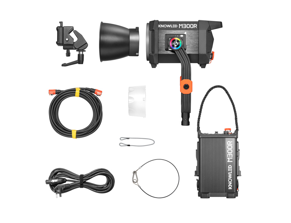 Die Stromversorgung der KNOWLED M300R ist wahlweise über das Stromnetz oder unterwegs per V-Mount-Akku möglich. Für die Steuerung stehen mehrere Möglichkeiten zur Auswahl: direkt am Gerät, per Smartphone-App, über DMX (Digital Multiplex, ein Standard in der Lichttechnik), CRMX-Funkprotokoll (kabelloses DMX) oder Ethernet. Dadurch lässt sich die Leuchte sowohl in bestehende Studio-Infrastrukturen als auch in Live-Produktionen integrieren.