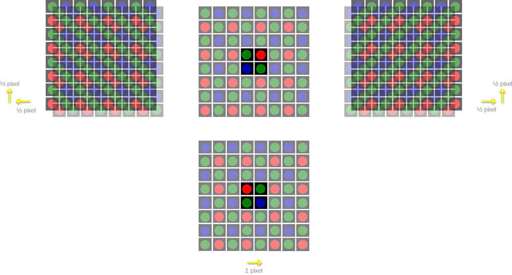 Der Vorteil des Verfahrens gegenüber dem Zusammenquetschen der Pixel auf einem relativ kleinen Sensor ist, dass die sonst auftretenden Probleme von stärkerem Rauschen vermieden werden. Auch kann man wählen, ob eine Aufnahme die hohe Auflösung überhaupt benötigt und die große Dateigröße rechtfertigt oder ob man lieber weniger Speicherplatz belegen möchte. Allerdings hat das Verfahren der Bildkombination auch einen kleinen Nachteil: Da mehrere Fotos unmittelbar nacheinander gemacht werden, eignet sich das Vorgehen nicht für bewegte Objekte und das Fotografieren aus der Hand.