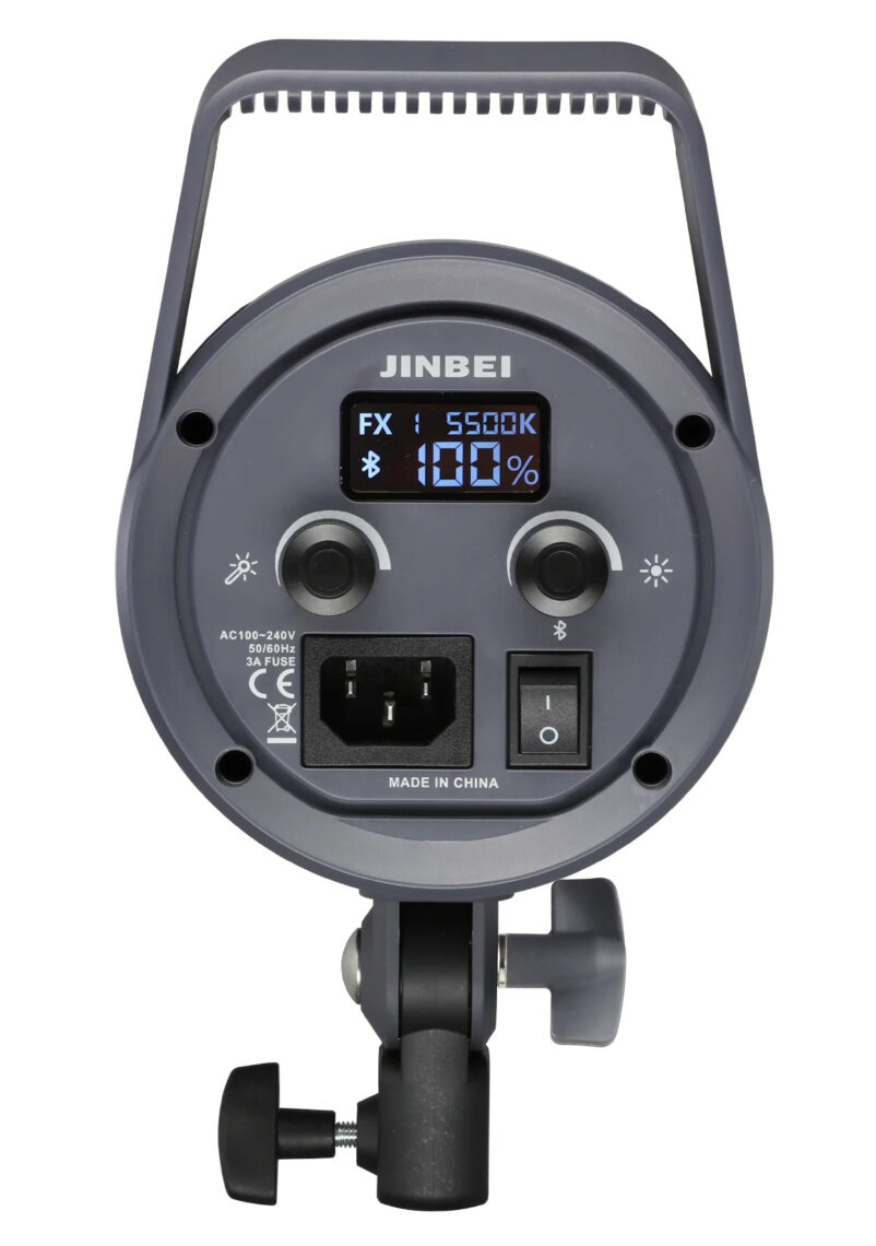 Auf der Rückseite befinden sich mechanische Bedienelemente und ein LC-Display. Die Lichter sind aber auch mit der kostenlosen Smartphone-App „Studio“ für Android-Nutzer und „Jinbei“ für iOS-Nutzer steuerbar. Das Bowens S-Type-Bajonett ermöglicht die Nutzung gängiger Lichtformer.