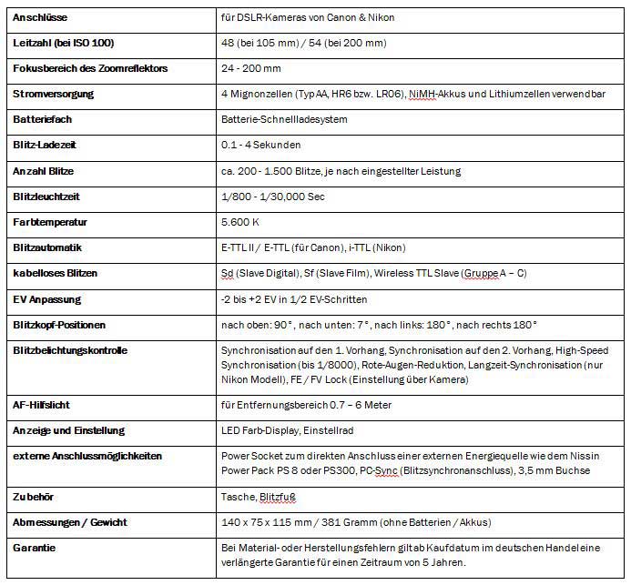 Der von vier AA-Batterien mit Energie versorgte Blitz ist u.a. mit einem Power Socket ausgestattet, an dem sich externe Stromquellen wie der PowerPack PS8 von Nissin anschließen lassen, die für mehr Leistung und Ausdauer sorgen, speziell bei Serien-Blitzaufnahmen. Abhängig von der verwendeten Kamera unterstützt die Highspeed-Synchronisation (HSS) des Nissin Verschlusszeiten von bis zu 1/8000 Sekunden.