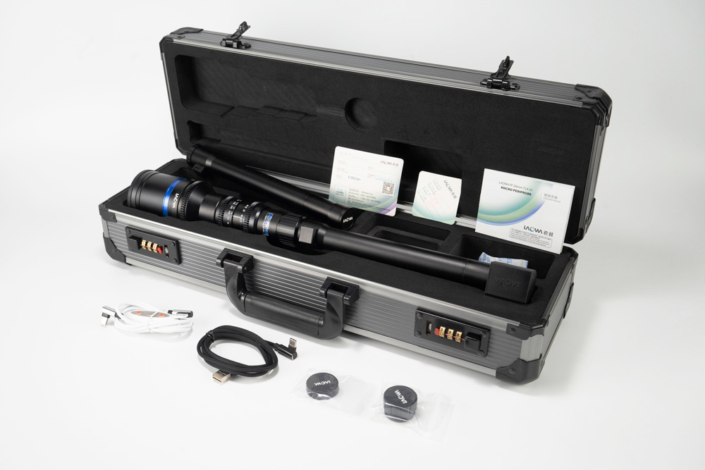 Das LAOWA 24mm T14 2X Periprobe wird in einem hochwertigen Koffer mit Zahlenschloss geliefert. Darin sind neben dem Objektiv ein 90°-Periskoptubus, ein 0°-Sondentubus, ein Objektiv-Frontdeckel, ein Objektiv-Rückdeckel, zwei Tubus-Rückdeckel, zwei Tubus-Frontdeckel, ein dimmbares USB-Kabel und ein normales USB-Kabel enthalten.