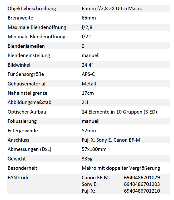 LAOWA 65mm f/2,8 2X Ultra Macro Technische Daten