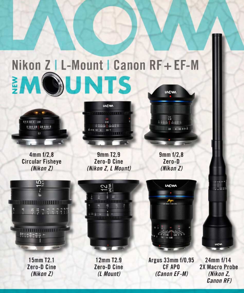 Venus Optics will ab Mitte Oktober 2021 sieben Laowa-Objektive mit neuen Anschlussvarianten anbieten: Nikon Z, L Mount und Canon RF sowie Canon EF-M. Diese verteilen sich auf das 24mm 2X Macro Probe (Nikon Z und Canon RF), das 4mm Circular Fisheye-Objektiv (Nikon Z), das erst kürzlich vorgestellte lichtstarke Argus 33mm (Canon EF-M), das 9mm Zero-D (Nikon Z und L Mount) sowie drei Cine-Objektive mit 9 (Nikon Z), 12 (L Mount) und 15mm (Nikon Z) Brennweite. Details können Sie dem oben stehenden Übersichtsbild entnehmen. Weitere Informationen finden Sie auf den Internetseiten des Laowa-Vertriebspartners B.I.G. GmbH und auf den Laowa-Internetseiten.