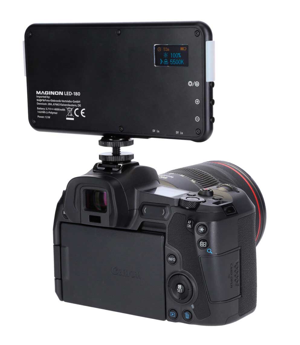 Maginon präsentiert mit dem „LED-180“ ein akkubetriebenes LED-Dauerlicht für Video- und Fotografie. Das LED-Panel hat in etwa die Abmessungen eines Smartphones und ist mit 180 dimmbaren LEDs (90 Warmlicht- und 90 Weißlicht-LEDs) ausgestattet, sodass die Farbtemperatur des abgegebenen Lichts zwischen 3200 K und 5500 K stufenlos eingestellt werden kann. Der Hersteller gibt einen Farbwiedergabeindex von mindestens 96% an. Die Leuchte bietet eine Akkulaufzeit von bis zu 9,5 Stunden und wird per USB aufgeladen.