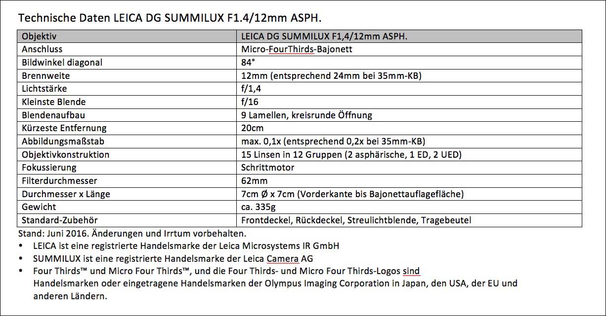 Das LEICA DG SUMMILUX F1,4/12mm ASPH. verfügt über einen Metalltubus, ein robustes Metallbajonett sowie eine ebenfalls aus Metall gefertigte Streulichtblende. Es hat ein 62mm-Filtergewinde, sein Gewicht liegt bei 335 Gramm.