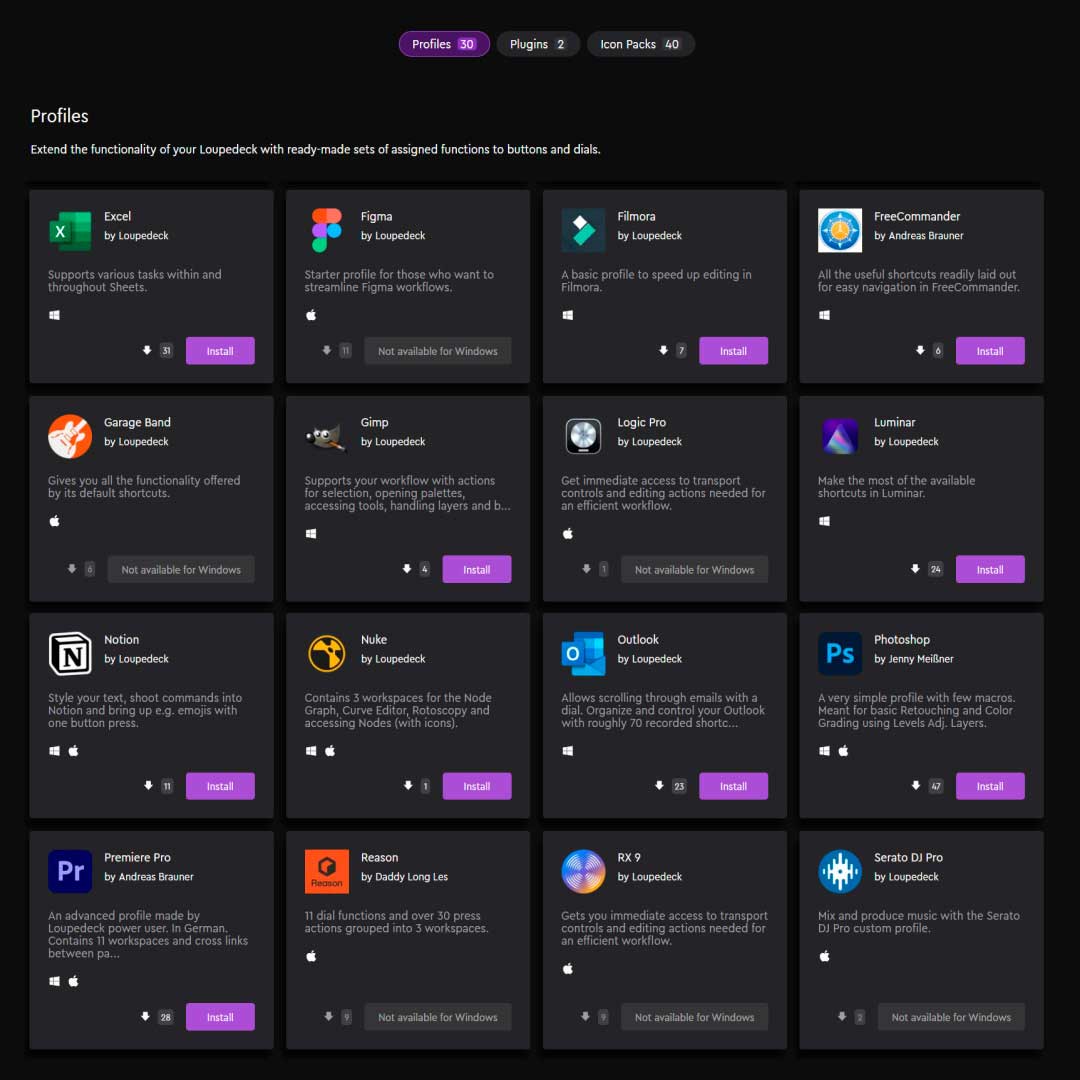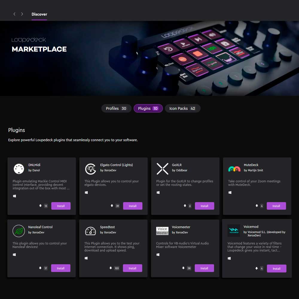 Mit dem Loupedeck-Update geht außerdem der Loupedeck-Marketplace an den Start. Aktuell stehen in dieser Content-Bibliothek Profile, Plug-ins und Icon-Pakete für Anwender zum Download bereit, um die Funktionen Ihrer jeweiligen Loupedeck-Konsole zu erweitern. In Zukunft sollen weitere Kategorien hinzukommen, beispielsweise für Sounds und Grafiken.