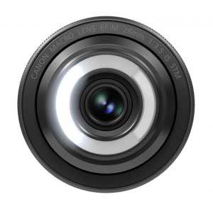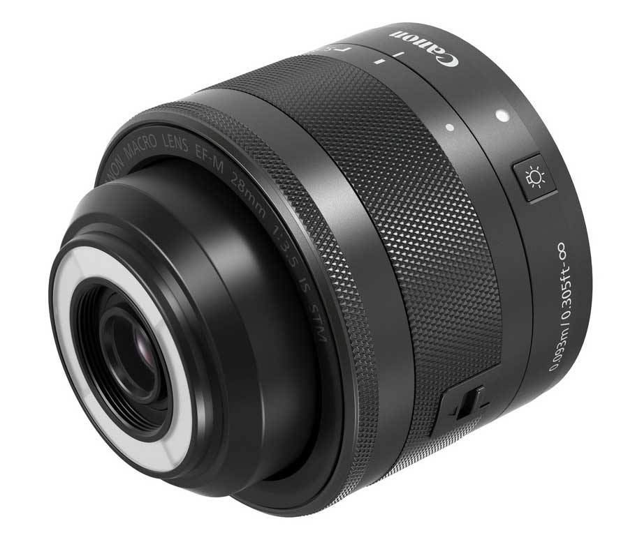 EF-M 28mm f3.5 Macro IS STM FSL normal mode Canon präsentiert ein Makro-Objektiv mit 1,2-facher Vergrößerung für seine EOS-M-Kameras, das mit einer integrierten Makro-Leuchte ausgestattet ist. Über eine Taste am Objektiv lässt sich diese bezüglich Intensität und Lichtrichtung (von links und/oder von rechts) umschalten. Das Objektiv ist so geformt, dass der Schattenwurf von Kamera und Objektiv deutlich reduziert wird.