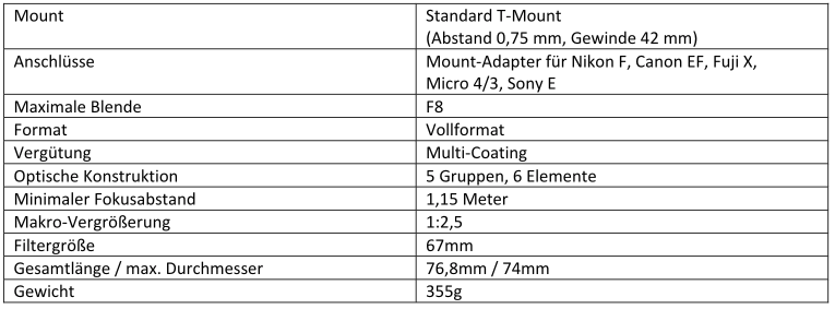 Das optische System besteht aus nur 6 Elementen, die in fünf Gruppen angeordnet sind. Es erzeugt ein charakteristisches Donut-förmiges und sehr glattes Bokeh. Der Drehbereich des Fokusrings ist mit 270 Grad recht groß und erlaubt so eine präzise Fokussierung. Beim kleinstmöglichen Aufnahmeabstand ergibt sich ein Abbildungsmaßstab von 1:2,5.