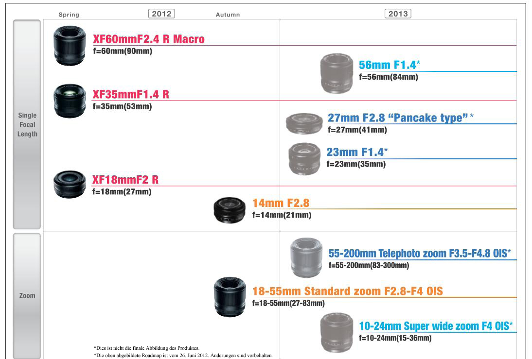 Laut der von Fujifilm veröffentlichten Objektiv-Roadmap (s.u.) kommen im Frühjahr 2013 noch zwei Zoomobjektive und drei Festbrennweiten hinzu.