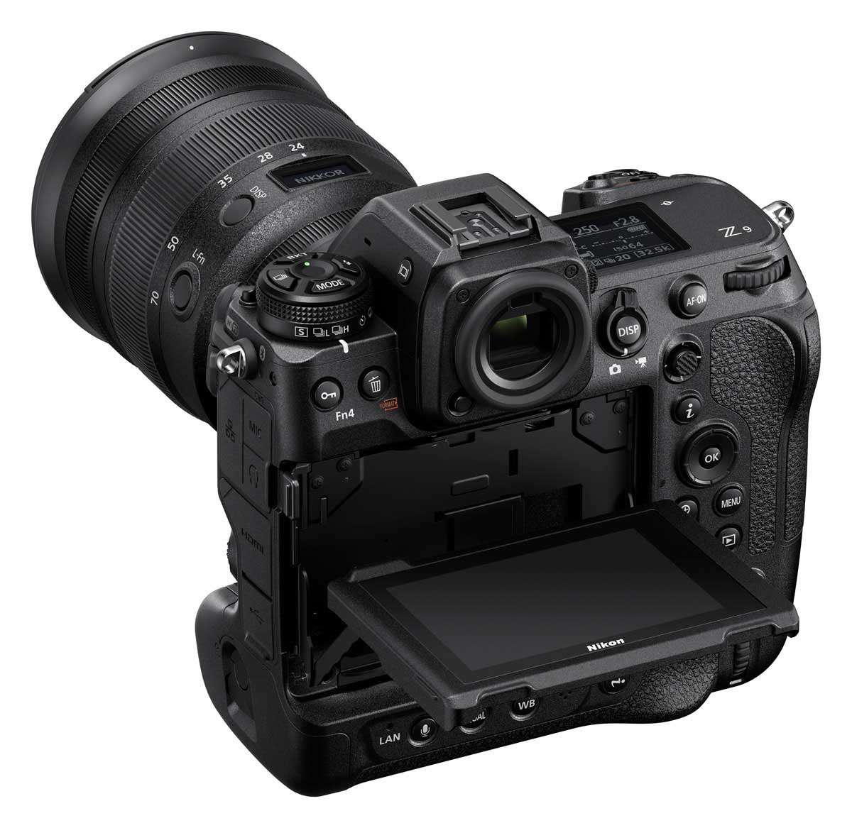 Als weiteres Novum bei Nikon ist die Z 9 mit einem vertikal und horizontal neigbaren 4-Achsen-Monitor ausgestattet, der es Fotografen ermöglicht, sich mit einer schnellen, flexiblen Bildgestaltung an den jeweiligen Moment anzupassen. Die Ergonomie der Kamera, wie beispielsweise die Anordnung der Tasten, wurde zusammen mit Profifotografen erarbeitet und verbessert. Die Robustheit der Z 9 geht über die der D6 hinaus und sorgt dafür, dass sich Nutzer auch unter rauen Bedingungen auf ihr Werkzeug verlassen können. Mit der neuen AF-Modus-Taste kann der AF-Modus und die AF-Messfeldsteuerung während der Aufnahme intuitiv umgeschaltet werden. Das obere und das rückwärtige LCD-Display sowie die Tasten leuchten bei Betätigung des Hauptschalters auf, um Änderungen der Einstellungen im Dunkeln zu erleichtern.