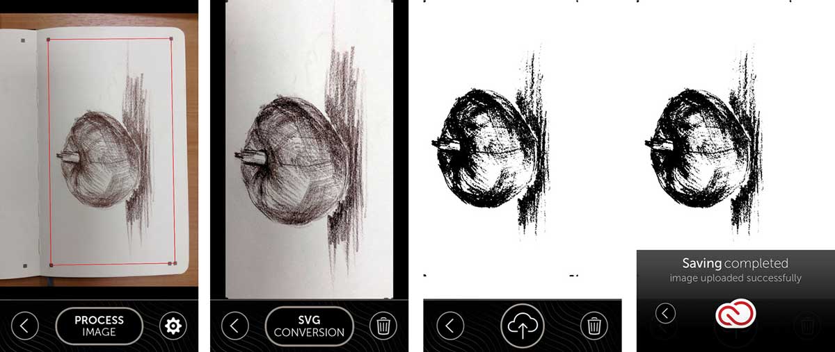 Die Benutzung des Buches und der kostenlosen iPhone-App ist ganz einfach: Zum Digitalisieren wird eine bemalte Seite mit Hilfe der App fotografiert. Diese nutzt die Seitenmarkierungen, um das Bild als JPG-Datei zu verarbeiten und zu optimieren, bevor es in eine SVG-Datei konvertiert wird. Danach kann man sich in seinen Creative Cloud-Account einloggen, die Vektordatei hochladen und diese sofort oder später zur weiteren Bearbeitung in Adobe Illustrator CC oder Adobe Photoshop CC öffnen.