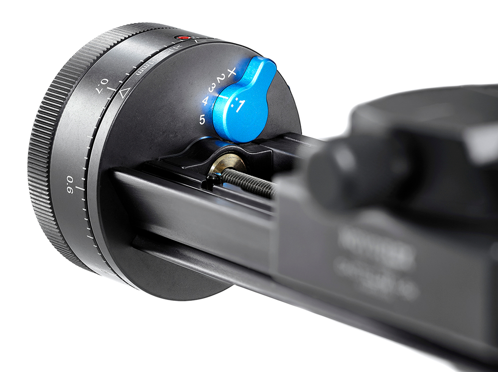 Der Castel M besitzt nicht nur eine Spindel, die das Gleitstück präzise antreibt, sondern erstmals auch Raststufen für Abbildungsmaßstäbe von 2:1, 3:1, 4:1 und 5:1. Diese werden über das hintere Fokusrad gesteuert und ermöglichen wiederholgenaue Positionen. Dazu muss nur bei jedem Rastschritt des Fokusrades eine Aufnahme gemacht werden. Der notwendige Vorschub und die Überlappung der Einzelaufnahmen werden über die Einzelschritte definiert.