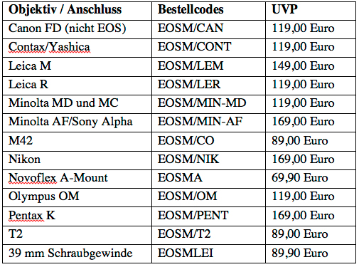 Die neuen Adapter für die EOS M gibt es für folgende Objektivanschlüsse: