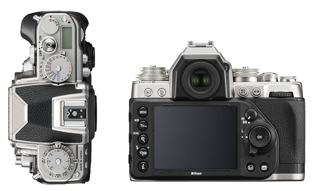 Das Gehäuse der Df ist in klassischem Schwarz oder in Silber mit schwarzen Elementen erhältlich. Der strukturierte Griff, die mechanischen Wahlräder und die flache Oberseite gehen auf die analogen Spiegelreflexkameras von Nikon – wie die F2 und F3 – zurück.