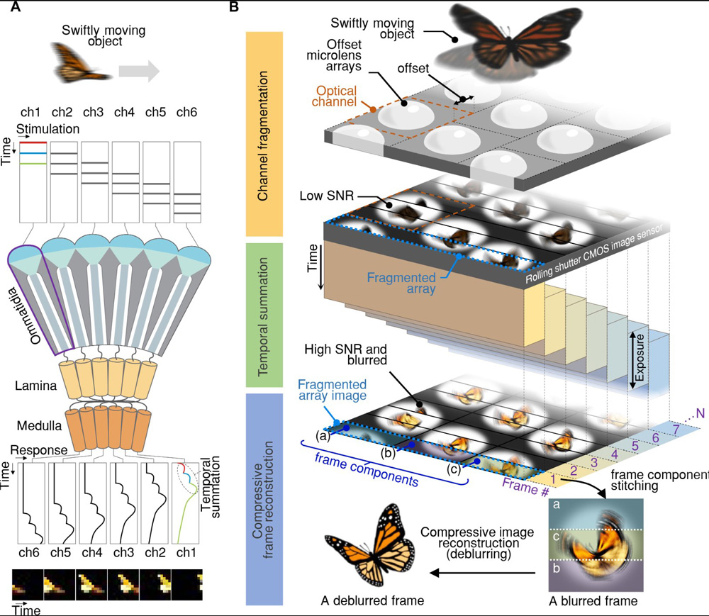 (A) Sehen bei einem schnelläugigen Insekt. Reflektiertes Licht von sich schnell bewegenden Objekten stimuliert die Photorezeptoren entlang der einzelnen optischen Kanäle, die Ommatidien genannt werden, deren visuelle Signale separat und parallel über die Lamina und Medulla verarbeitet werden. Jede neuronale Antwort wird zeitlich summiert, um die visuellen Signale zu verstärken. Die parallele Verarbeitung und die zeitliche Summierung ermöglichen eine schnelle und lichtarme Bildgebung bei schwachem Licht. (B) Hochgeschwindigkeit und HS-MAC. HS-MAC umfasst Kanalfragmentierung, zeitliche Summierung und komprimierte Bildrekonstruktion. oMLAs projizieren sich schnell bewegende Objekte über entsprechende optische Kanäle auf einen CMOS-Bildsensor mit Rolling Shutter. Die zeilenweise Belichtung fragmentiert die Kanäle horizontal in fragmentierte Arrays. Die zeitliche Summierung jedes fragmentierten Arrays verbessert den SNR bei schlechten Lichtverhältnissen und führt zu einer Überlappung der zeitlichen Informationen in benachbarten Bildern. Die Bildkomponenten eines einzelnen fragmentierten Array-Bildes werden zu einem einzigen unscharfen Bild zusammengesetzt, das anschließend durch komprimierende Bildrekonstruktion entschärft wird.