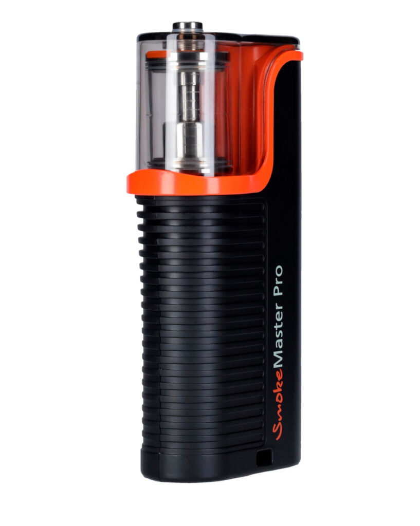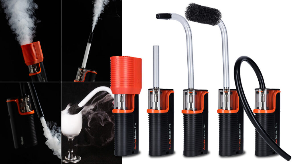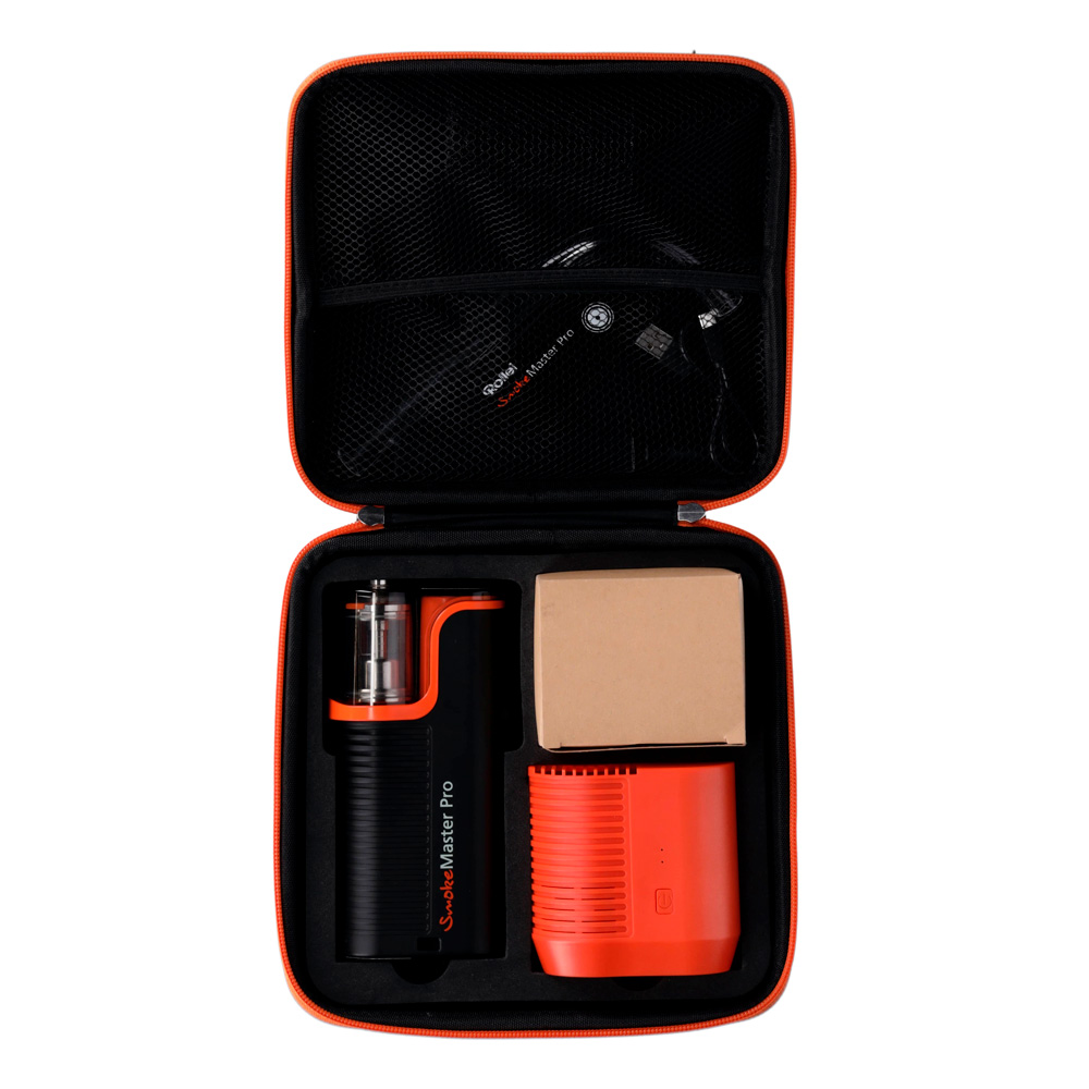 Der SmokeMaster Pro wiegt nur 360 Gramm und kann in der mitgelieferten Tasche zusammen mit Ersatz-Flüssigkeiten, Aufsätzen, Fernbedienung und Ladekabel verstaut werden.