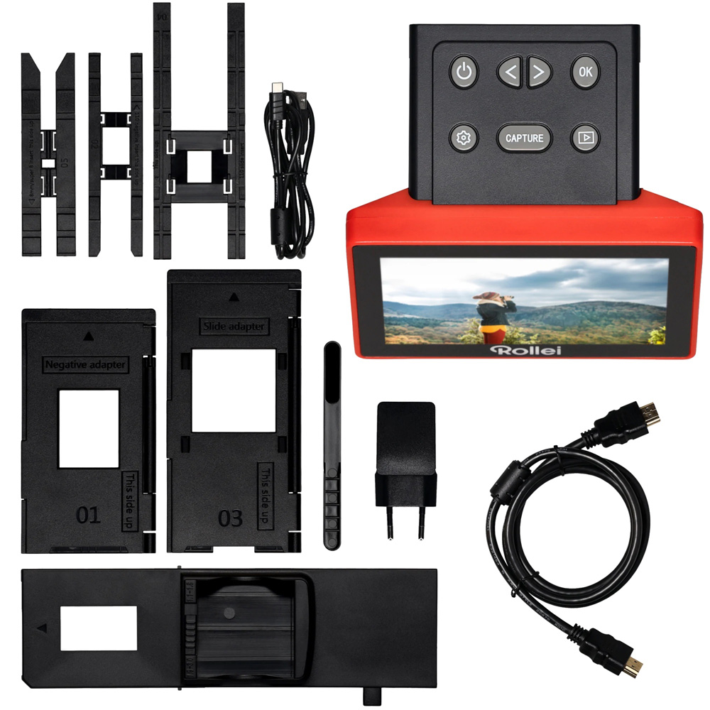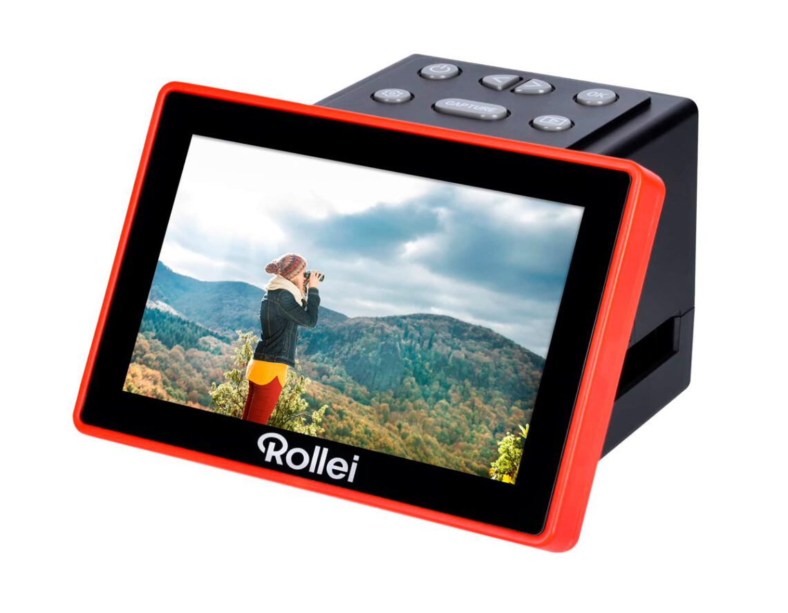Am TFT-LCD-Farbmonitor mit 5-Zoll-Bildschirmdiagonale wird das Ergebnis des Scans angezeigt und kann bei Bedarf direkt bearbeitet werden. Die Bedienung erfolgt mit mechanischen Tasten. Rollei liefert Halterungen für verschiedene Dia- und Negativ-Vorlagen mit, unter anderem für Kleinbild- und Super8-Filme.