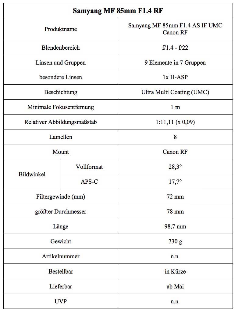 Objektivhersteller Samyang kündigt zum Mai dieses Jahres zwei Objektive für das neue EOS-R-System von Canon an: ein Ultraweitwinkelobjektiv mit 14 Millimeter Brennweite und Lichtstärke f/2,8 sowie ein 85-Millimeter-Objektiv mit Lichtstärke f/1,4. Die Fokussierung und die Blendeneinstellung können nur manuell erfolgen. Es werden keine Daten mit der Kamera ausgetauscht. Preise gab die Walser GmbH, bei der die Objektive des Herstellers Samyang erhältlich sind, noch nicht bekannt.