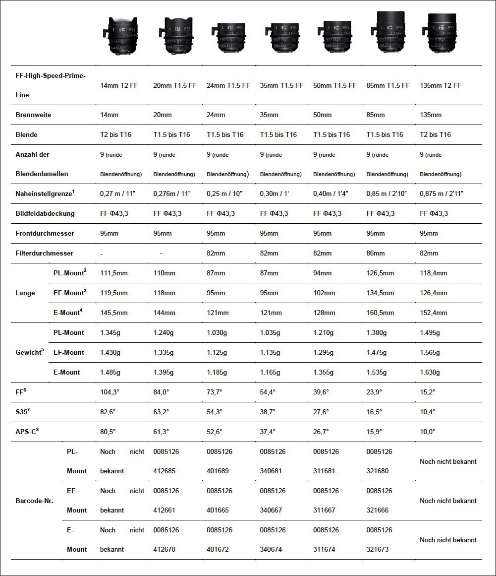 Film-Objektive: Technische Daten der FF-highspeed-Prime-Line