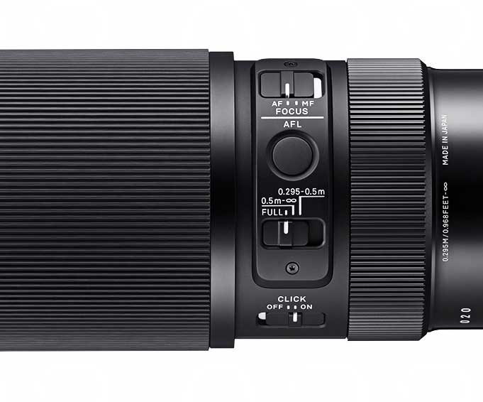 Zur professionellen Ausstattung des Objektivs gehören eine individuell belegbare AFL-Taste, ein Fokusmodus-Schalter (AF/MF), ein Fokusbereichsbegrenzer (29,5 – 50 cm / 50 cm – ∞ / Full), ein Blendenring-Klick-Schalter (für geräuschlose manuelle Blendenwahl) und ein Blendenring-Sperrschalter sowie die Abdichtung gegen Staub und Spritzwasser.