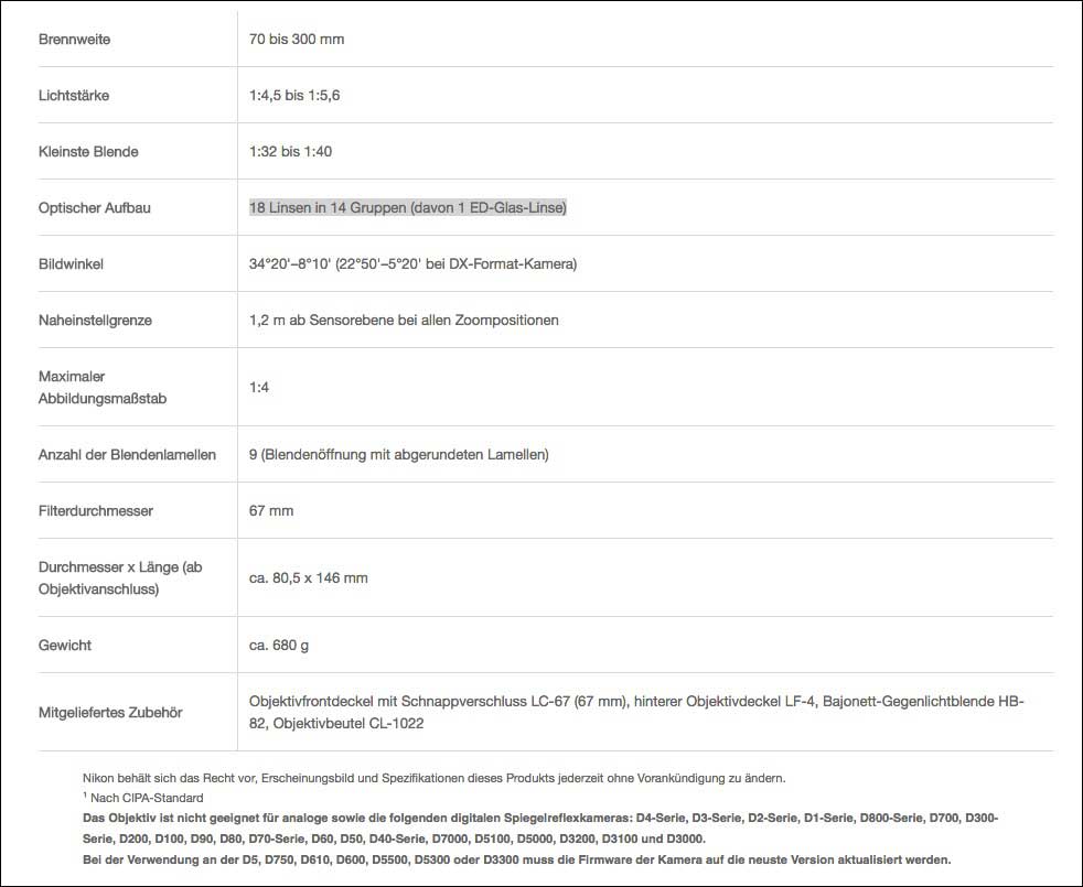 Das 680 Gramm schwere Objektiv zeichnet sich durch eine Naheinstellgrenze von 1,2 Meter über den gesamten Zoombereich und einen maximalen Abbildungsmaßstab von 1:4 aus. Sein optisches System besteht aus 18 Linsen in 14 Gruppen (davon 1 ED-Glas-Linse).
