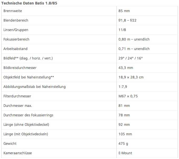 Das gemäßigte Tele-Objektiv ZEISS Batis 1.8/85 besitzt elf Linsen in acht Gruppen im ZEISS Sonnar-Optikdesign. Drei Linsen aus Sondergläsern sollen sorgen für höchste Abbildungsqualität sorgen. Das Objektiv eignet sich besonders für die Hochzeits-Fotografie und Portraitaufnahmen, wobei das Hauptmotiv dank der hohen Lichtstärke kreativ freigestellt werden kann. Dank einer optischen Bildstabilisierung gelingen auch Aufnahmen bei schwachem Licht und bewegten Motiven.