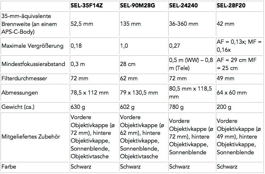 Sony erweitert sein Objektiv-Portfolio um vier Objektive für das Vollformat und vier Konverter – jeweils zwei für Vollformat- und APS-C-Kameras. Zu den neuen Objektiven zählen ein lichtstarkes 35mm-Distagon von Zeiss, ein 90mm-Makro, ein 28mm-Weitwinkel und ein 10fach-Zoom mit 24 bis 204 mm Brennweite. Alle Objektive sind gegen Staub und Feuchtigkeit geschützt.