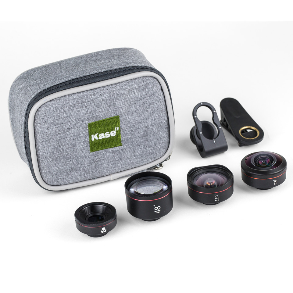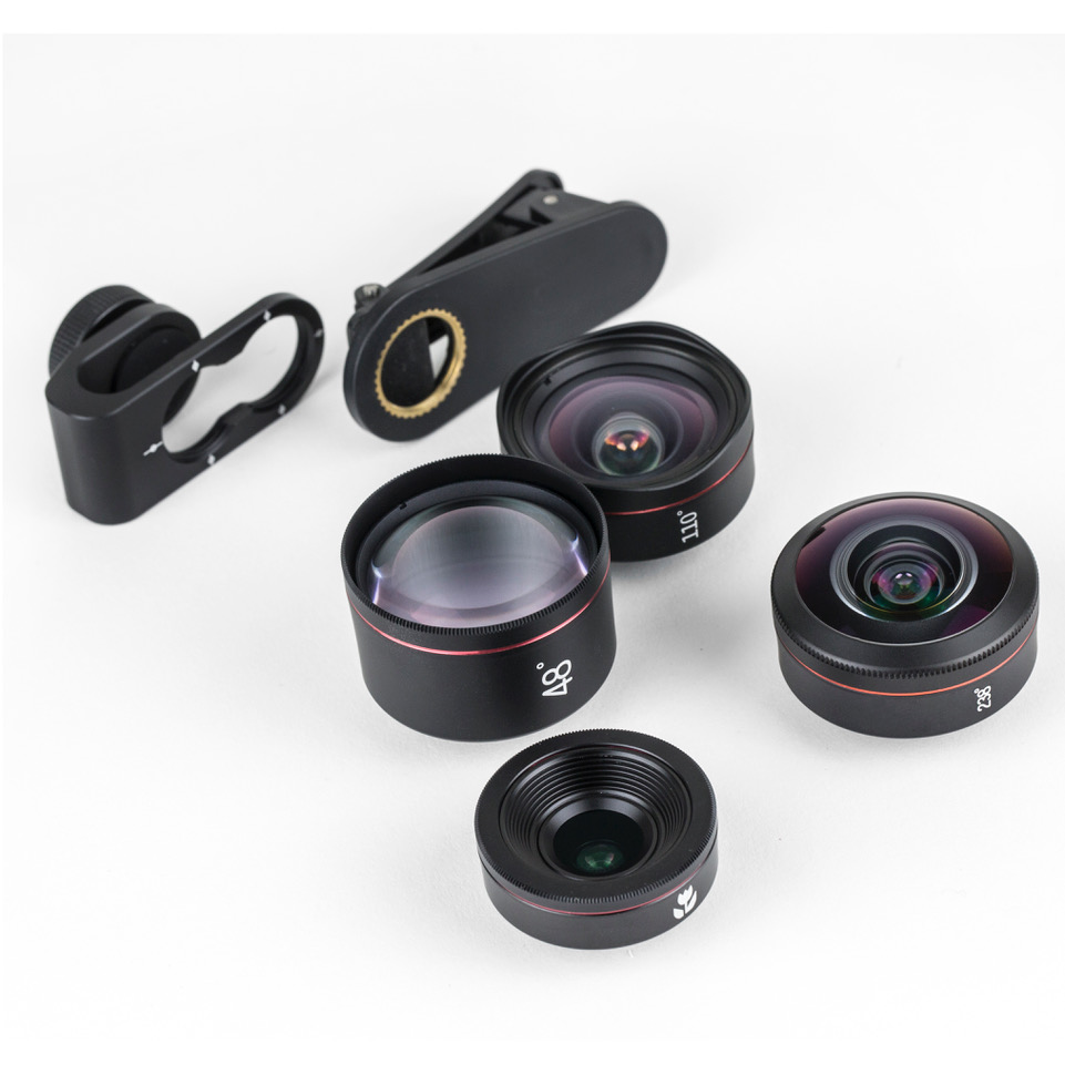 Für die meisten Einsatzzwecke ist man mit dem „Objektiv-Kit Serie II 4 in 1“ gerüstet. Es beinhaltet ein Weitwinkel-, ein Tele-, ein Fisheye- und ein Makro-Objektiv, eine stabile Klammer zum Anklipsen und eine U-förmige Klammer zum Aufstecken auf das Smartphone sowie ein Etui. Beide Klammern sind mit einem Gewinde ausgestattet, auf das jedes Objektiv aufgeschraubt und je nach Bedarf schnell ausgetauscht werden kann. Das Kit kostet 199 Euro.