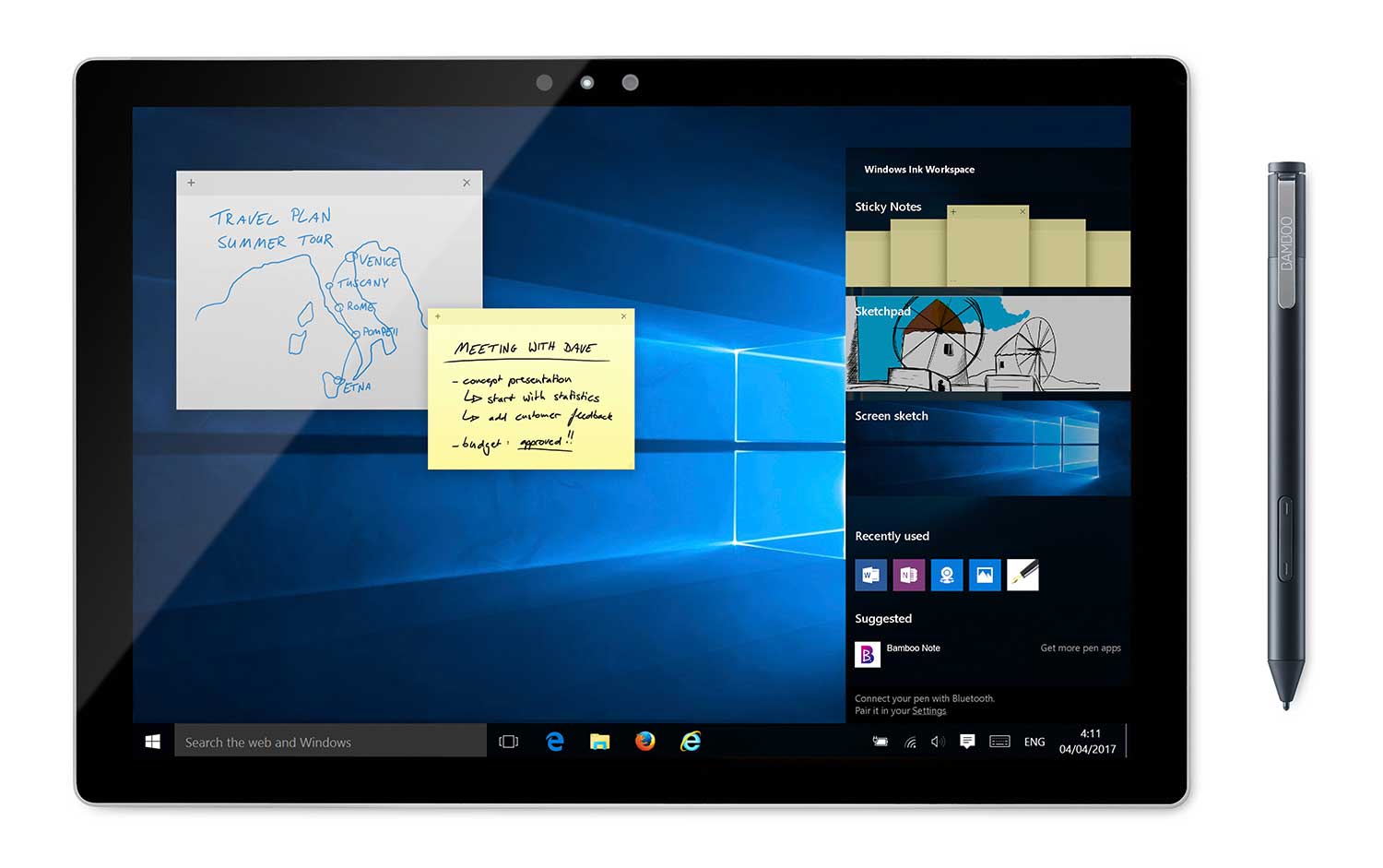 Mit dem neuen Eingabestift für den „Windows Ink“-Arbeitsbereich können Kreative auf den meisten Geräten mit Windows 10 in „Windows Ink“ Notizen festhalten, Ideen skizzieren oder Dokumente markieren.