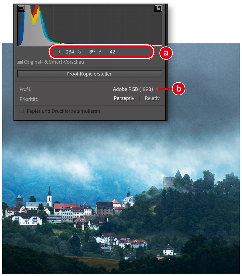 Lightroom Classic zeigt im Entwickeln-Modul die Tonwerte, über die Sie im Bild den Cursor bewegen, unter dem Histogramm in Prozentwerten an. Für Anwender von Camera Raw und Photoshop ist das ungewohnt, da die Tonwerte im »Info«-Panel oder in Einstellungsdialogen wie der »Tonwertkorrektur« oder der »Gradationskurve« meist in den 8-Bit-Abstufungen von 0 bis 255 dargestellt werden. Technisch gesehen ist die Anzeige in Prozentwerten insofern plausibel, da die Tonwertauflösung erst beim Export festgelegt wird. Sie können sich diese aber dennoch in 256 Stufen pro Kanal (a) anzeigen lassen, indem Sie die Taste »S« drücken, wodurch Sie »Ansicht > Softproof > Proof anzeigen aktivieren«. Unter dem Histogramm wählen Sie das Ausgabeprofil (b). Für das Internet bietet sich hier sRGB an.