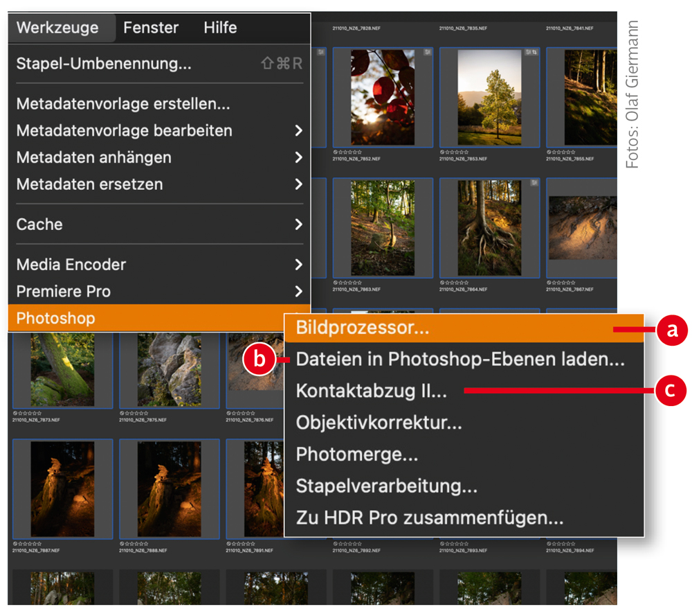 Aus Adobe Bridge heraus können Sie Dateien an die verschiedenen Creative-Cloud-Programme senden. Skripte im Menü »Werkzeuge« bieten dabei erweiterte Funktionen. So wandeln Sie mit dem »Bildprozessor« (a) Bilder in andere Formate um und wenden bei Bedarf gleichzeitig eine Aktion an. Ausgewählte Dateien lassen sich als Stapel von Photoshop-Ebenen laden (b); dabei erhalten die Ebenen automatisch den Dateinamen. Über den »Kontaktabzug« (c) erzeugen Sie eine Bildübersicht mit kleinen Vorschauen, die Sie sich zum Beispiel als Merkhilfe für Festplatteninhalte ausdrucken oder als PDF speichern können. Andere aufgeführte Befehle sind vor allem durch aktuelle Camera-Raw-Workflows mehr oder weniger veraltet: Objektiv- und Stapelkorrekturen sowie Panorama- und HDR-Erzeugung sind in Camera Raw einfacher und qualitativ besser durchzuführen.