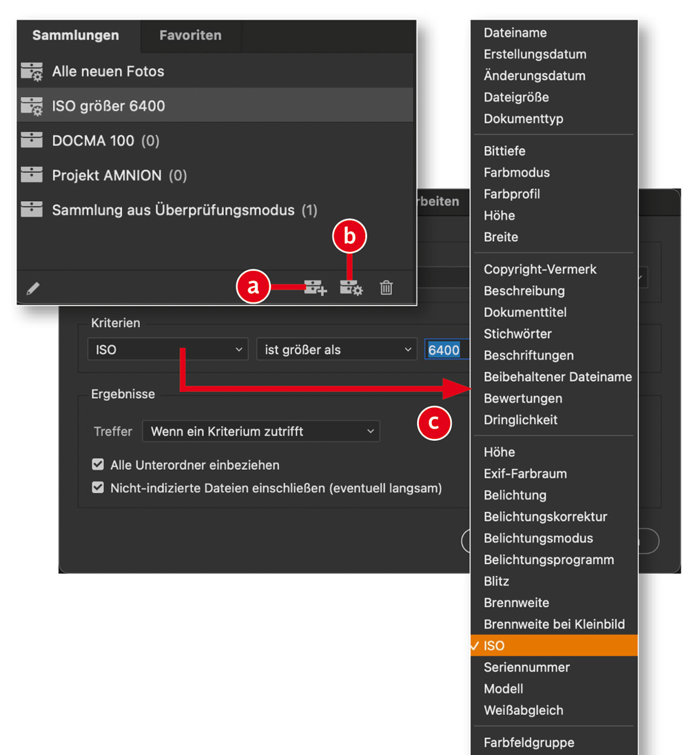 Wenn Sie Assets von verschiedenen Speicherorten für einzelne Projekte zusammentragen, müssen Sie diese nicht duplizieren und in einen gemeinsamen Ordner speichern. Das Fenster »Sammlungen« erspart Ihnen dabei entstehende Redundanzen und den dadurch resultierenden hohen Speicherbedarf. Erzeugen Sie für das jeweilige Projekt eine Sammlung (a) und fügen Sie dieser die benötigten Dateien per Drag-and-Drop hinzu. Mit »Smartsammlungen« (b) speichern Sie Suchabfragen, die den Dateinamen, Exif- und Metadaten, Farb- und Sterne-Markierung sowie Stichwörter beinhalten können. All diese Kriterien (c) lassen sich beliebig komplex ein- und ausschließen und gelten für einzelne Verzeichnisse oder auch gesamte Festplatten.
