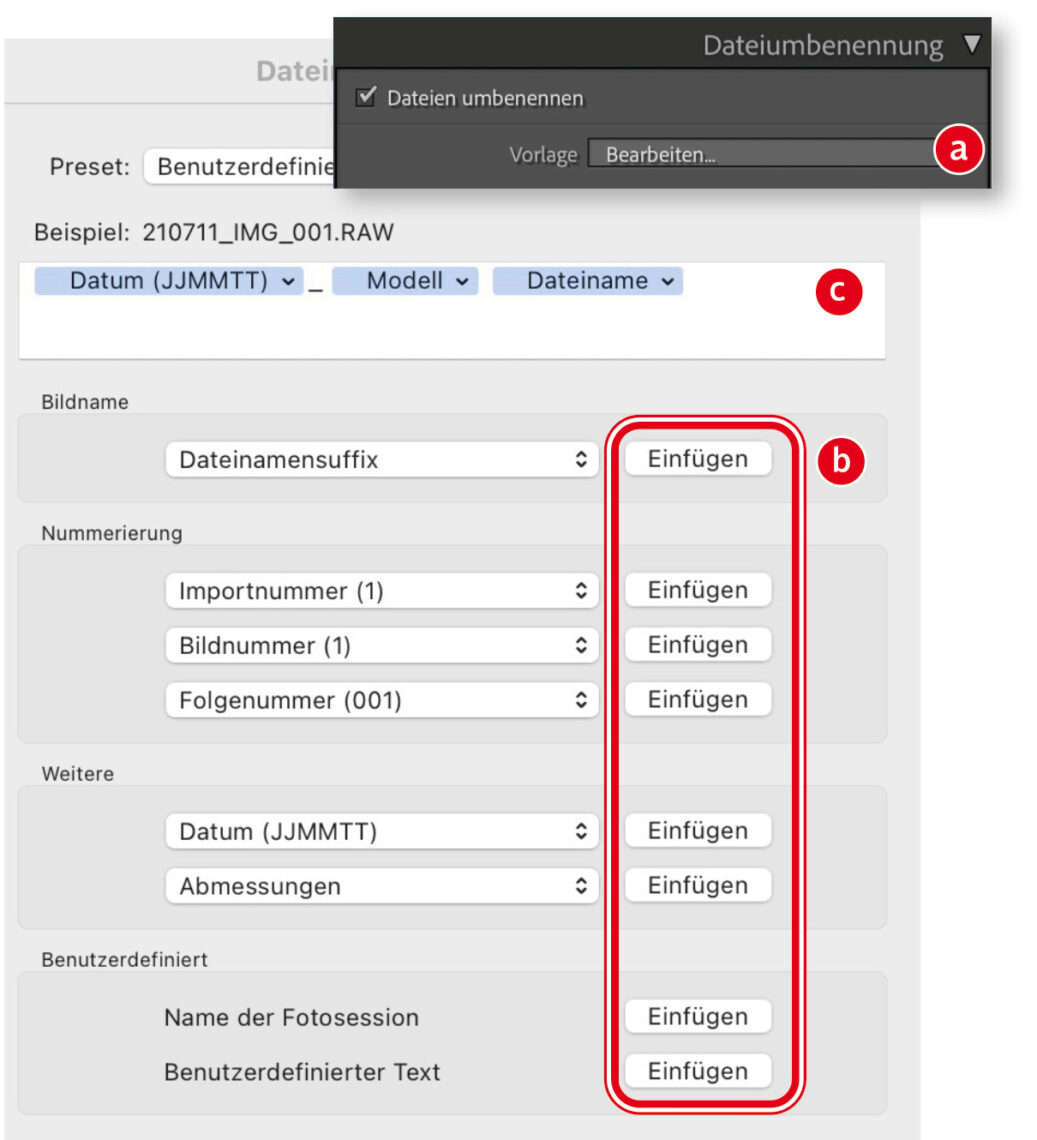 Im Importdialog können Sie durch Aktivierung der Checkbox »Dateien umbenennen« Ihren Fotos neue Dateinamen nach selbst gewählten Kriterien zuweisen. Das Ziel dieser Umbenennung ist es, sicherzustellen, dass alle Ihre Fotos einen eindeutigen Dateinamen erhalten. Am sichersten geschieht das, indem Sie vor den durch die Kamera vergebenen Dateinamen das numerische Datum der Aufnahme und die Kamerabezeichnung setzen. Auf diese Weise vermeiden Sie auch identische Dateinamen, wenn Sie bei einem Shooting mehrere Kameras verwenden, die anschließend im gleichen Ordner landen. Klicken Sie zum Festlegen der Namenskonvention auf »Vorlage > Bearbeiten« (a). Im sich öffnenden Editor wählen Sie die Metadaten aus und fügen diese per Schaltfläche (b) in das Namensfeld (c) ein.