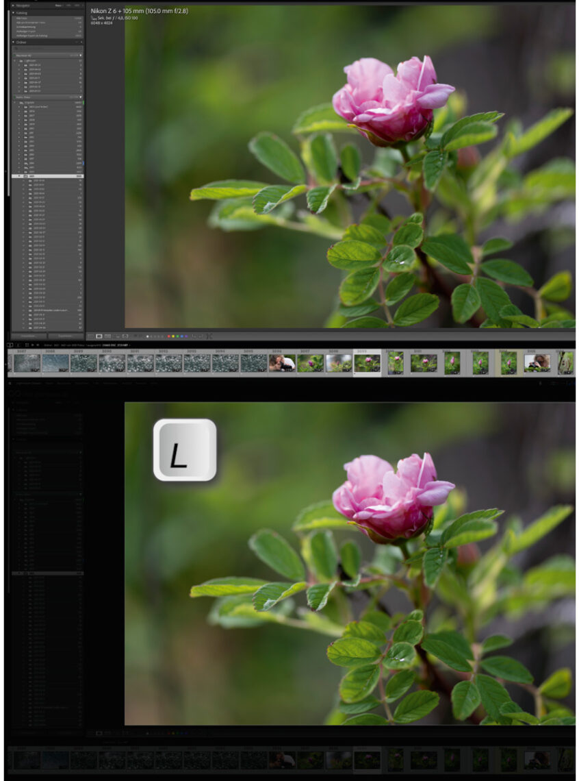 Der Beleuchtungsmodus reduziert die Helligkeit aller Bedienelemente oder blendet sie ganz aus. Vielleicht ist Ihnen das auch schon einmal passiert, dass Sie (oder Ihre Katze) unabsichtlich (wobei man sich bei Katzen da nicht sicher sein kann) eine Taste gedrückt hatten, und alle Bedienelemente stark abgedunkelt oder mit Schwarz überlagert dargestellt wurden? Wenn man die dafür verantwortliche Funktion nicht kennt, ist guter Rat teuer. Denn im Menü »Ansicht« findet man keine Lösung, die Ansicht wieder zurückzustellen. Versteckt ist die Option im Menü unter »Fenster > Beleuchtung«. Mit der Taste »L« schalten Sie durch drei verschiedene Ansichtsmodi, die es erlauben, die Bedienoberfläche von Lightroom auszublenden und den Fokus ganz auf ein Einzelbild in der Lupenansicht oder die Miniaturansichten in der Gitteransicht zu legen. Drücken Sie also einfach so oft »L«, bis die normale Ansicht wieder hergestellt ist.