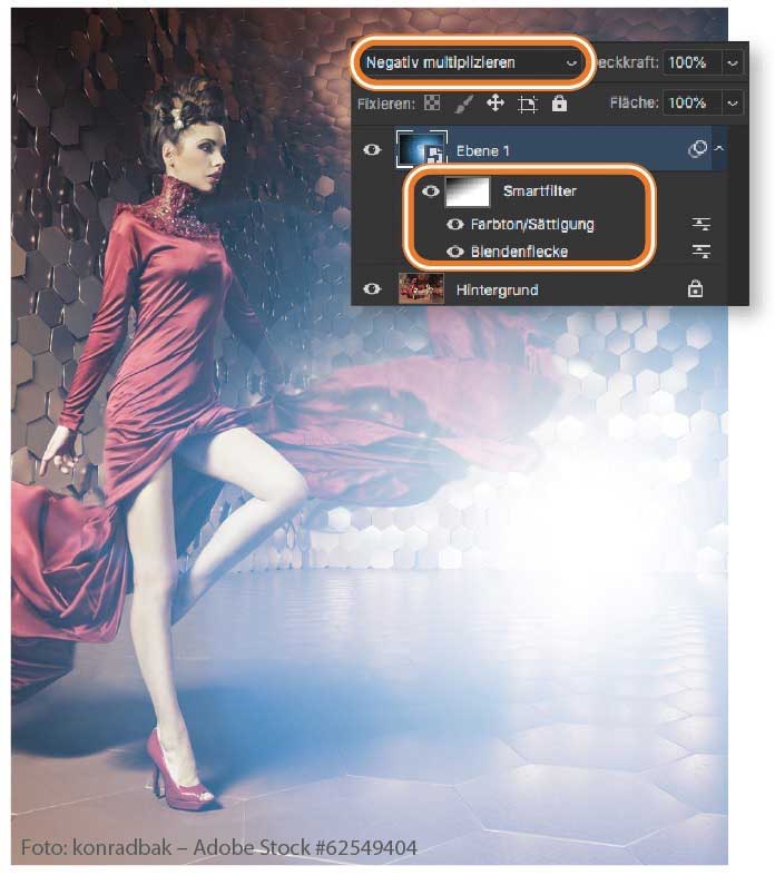 Blendenflecke-Effekte sind so ­modern wie nie zuvor. Photoshops »Blendenflecke«- Filter ist dagegen in die Jahre gekommen. Nützlich ist er trotz seiner wenigen Möglichkeiten, wenn Sie selbst variieren und kombinieren. Erzeugen Sie eine mit Schwarz gefüllte Ebene, wandeln Sie diese in ein Smartobjekt um, ändern Sie die Füll­methode in »Negativ multiplizieren« und wenden Sie den Renderfilter »Blendenflecke« an. Art, Position und Größe der Lichteffekte können Sie so jeder­zeit ändern. Blenden Sie unerwünschte Teile der erzeugten Überstrahlungen mit der Filter­maske aus. Die Farben der Blendenflecke ändern Sie schnell mit einer Einstellungsebene vom Typ »Farbton/Sättigung« als Schnittmaske. In Photoshop CC können Sie die Korrektur auch direkt als Smartfilter anwenden.