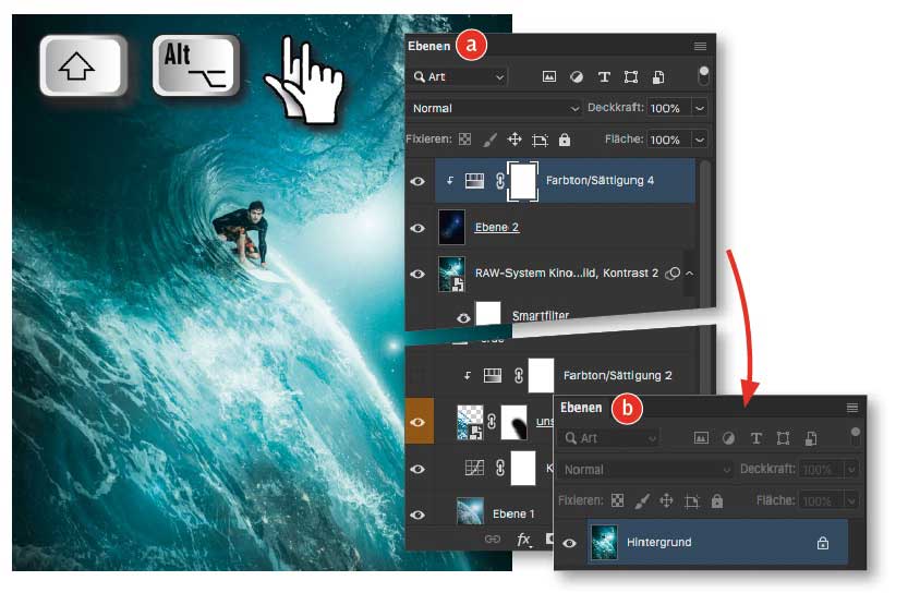 Adobe Bridge enthält einen versteckten Trick, den Sie auf keinem anderen Weg nutzen können. Wenn Sie »Shift-Alt« gedrückt halten und dann auf eine Datei doppelklicken, öffnet sich diese ohne Umweg und schnell in Photoshop. Bei einer Raw-Datei umgehen Sie so den Camera Raw-Dialog. Falls ein Foto bereits Camera Raw-Einstellungen aufweist, werden diese berücksichtigt. Ansonsten wird das Bild mit den Standardeinstellungen von Camera Raw in Photoshop geöffnet. Mit dem gleichen Trick öffnen Sie eine große Datei, die sehr viele Ebenen enthält (a), reduziert auf die Hintergrundebene (b), was sehr viel schneller geht, als die Datei erst zu öffnen und dann die Ebenen zusammenzufassen. Von Vorteil ist das, um beispielsweise ein Bild schnell für die Ausgabe zu optimieren. Aber Vorsicht: Wenn Sie anschließend »Datei > Speichern« oder »Strg/Cmd-S« nutzen, überschreiben Sie die Originaldatei und verlieren alle Ebenen! Nutzen Sie deshalb nach dem Öffnen auf diese Weise am besten immer den Befehl »Bild > Duplizieren« und schließen Sie das Original, ohne zu speichern.