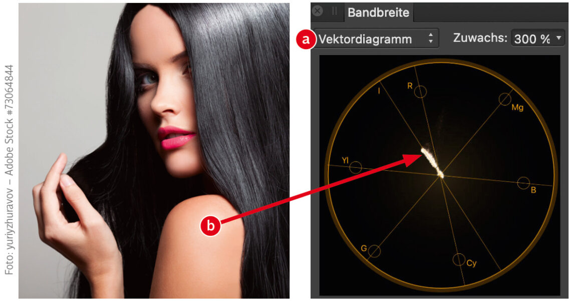 Was man in Videosoftware und in der englischen Version unter dem Begriff »Scopes« kennt, heißt dank missglückter Übersetzung in Affinity Photo »Bandbreite«. Hier finden Sie praktische Bildbeurteilungsdiagramme, die jeweils Rückschlüsse auf die Tonwertverteilung, Farbe und Sättigung erlauben. Ein wichtiges Werkzeug ist beispielsweise das »Vektordiagramm« (a), in dem die Sättigung von sechs Farbtonbereichen kreisförmig dargestellt wird. Hauttöne liegen auf der 10-Uhr-Linie (b). Abweichungen lassen sich im Vektordiagramm leicht feststellen und mit der »HSL«-Anpassung korrigieren.