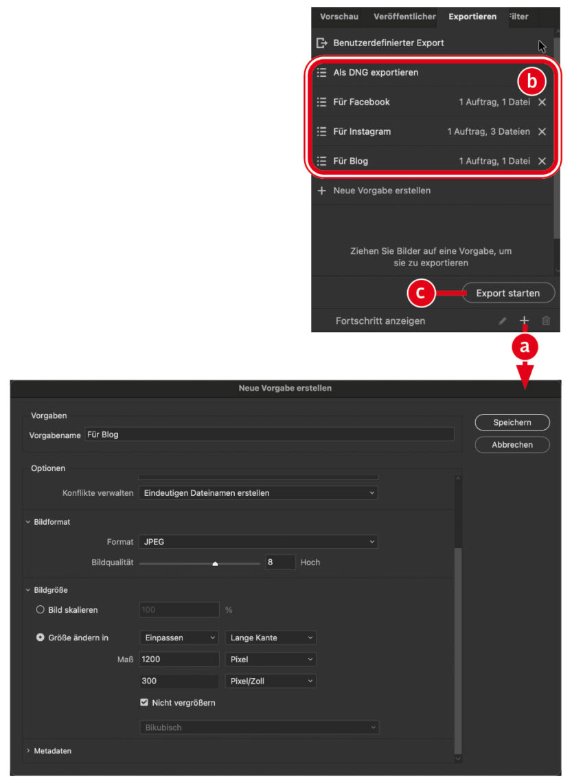 Immer wieder benötigte Format- und Größenänderungen führen Sie am einfachsten über das »Exportieren«-Fenster durch. Hier erzeugen Sie für den jeweiligen Anwendungszweck eine Vorgabe, in der Sie den Speicherort, das Bildformat, die Bildgröße und die enthaltenen Metadaten definieren (a). Die verschiedenen Presets erscheinen dann als Liste im »Exportieren«-Fenster. Bilder, die gemäß der Vorgabe bearbeitet werden sollen, ziehen Sie einfach auf die jeweilige Zeile (b). Der Export beginnt erst, wenn Sie auf die Schaltfläche »Export starten« (c) klicken.