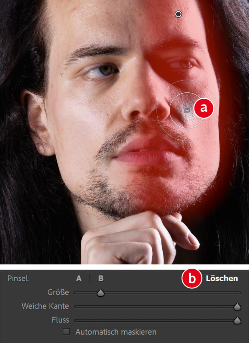 Der Korrekturpinsel maskiert Bearbeitungsbereiche in einem Bild. Mit gedrückter linker Maustaste fügen Sie dem Foto eine Maske hinzu. Halten Sie die »Alt«-Taste gedrückt, um die Maske an beliebigen Stellen wieder zu löschen. Als Pinselspitze erscheint dabei ein Minus-Symbol (a). Hierdurch sparen Sie sich die Aktivierung der »Löschen«-Funktion im »Pinsel«-Bedienfeld (b). Die Größe des Pinsels variieren Sie über das Mausrad. Mit gedrückter »Shift«-Taste können Sie zudem den Wert für die »Weiche Kante« beeinflussen.