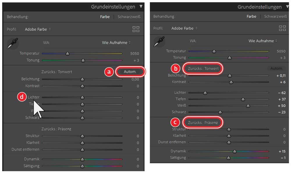 Die Automatikfunktionen von Lightroom Classic ermöglichen einen schnellen Einstieg in den Bearbeitungs-Workflow. Lightroom geht dabei von errechneten Werten aus, die Sie nach Belieben verändern können. Um alle Tonwerte von Lightroom einstellen zu lassen, klicken Sie im Bedienfeld »Grundeinstellungen« auf die Schaltfläche »Autom.« (a). Die Regler für die Tonwerte inklusive der »Dynamik« und »Sättigung« werden automatisch von Lightroom gesetzt. Um die Änderungen rückgängig zu machen, halten Sie die »Alt«-Taste gedrückt und klicken Sie auf die Schaltfläche zum Zurücksetzen der Werte (b) oder (c). Es ist auch möglich, einzelne Tonwertregler von Lightroom setzen zu lassen. Halten Sie dafür die »Shift«-Taste gedrückt und klicken Sie anschließend doppelt beispielsweise auf »Lichter« (d). Sie können nun den Wert noch anpassen oder den Regler mit einem einfachen Doppelklick auf »Lichter« wieder auf den Standardwert zurücksetzen.