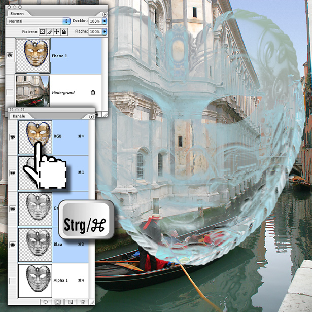 Eine einzelne Ebene einer Photoshop-Datei könnten Sie in der zuvor beschriebenen Weise als neuen Kanal derselben Datei hinzufu?gen. Nehmen wir dieses Bild: Auf der Hintergrundebene die venezianische Kirche Santa Maria dei Miracoli, auf der Ebene daru?ber eine bereits freigestellte Karnevalsmaske. Wir wollen in diesem Fall aber die obere Ebene nicht durch Ebenenverrechnungen in die Szene integrieren, sondern sie als Maske in einem Alphakanal verwenden, der dann als Auswahl geladen und farblich verändert werden soll. Wie gehen Sie dabei am effektivsten vor?
