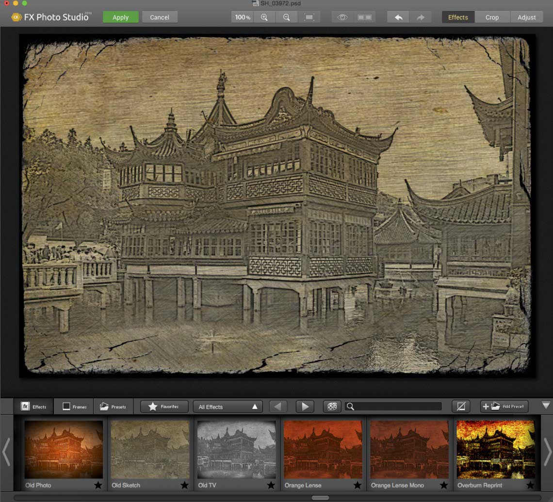 Haben Sie einen Look gefunden, klicken Sie auf »Apply« im Bildfenster. Falls Sie anschließend einen weiteren Effekt auflegen wollen, zum Beispiel einen Rahmen, dann können Sie sich bei den »Frames« eine entsprechende Randgestaltung wählen und klicken erneut auf »Apply«. Auf diese Weise addieren Sie weitere Effekte. Selbstverständlich können Sie jeden Effekt in den einzelnen Einstellungen ändern. Möchten Sie alle Looks an Photoshop übergeben, klicken Sie auf den »Apply« Button oben links und das Bild wird in Photoshop angezeigt.