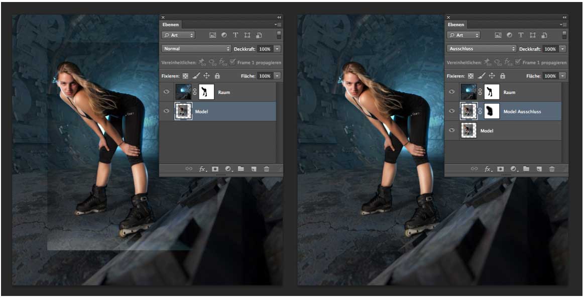Je einheitlicher der graue Hintergrund, desto einfacher ist das Freistellen. Die Technik ist simpel: Man legt den eigentlichen Hintergrund nicht unter die Freistellebene, sondern darüber, und verrechnet sie mit der Füllmethode »Ineinanderkopieren«. Danach malt man eine erstaunlich grobe Maske über die oben liegende Hintergrundebene. Aber oft bleiben Kanten sichtbar, weil der graue Hintergrund eben nicht überall gleich grau ist oder das Objektiv vignettiert. Die Lösung: Kopieren Sie die Ebene des Freistellers und verrechnen Sie sie mit der Füllmethode »Aus-